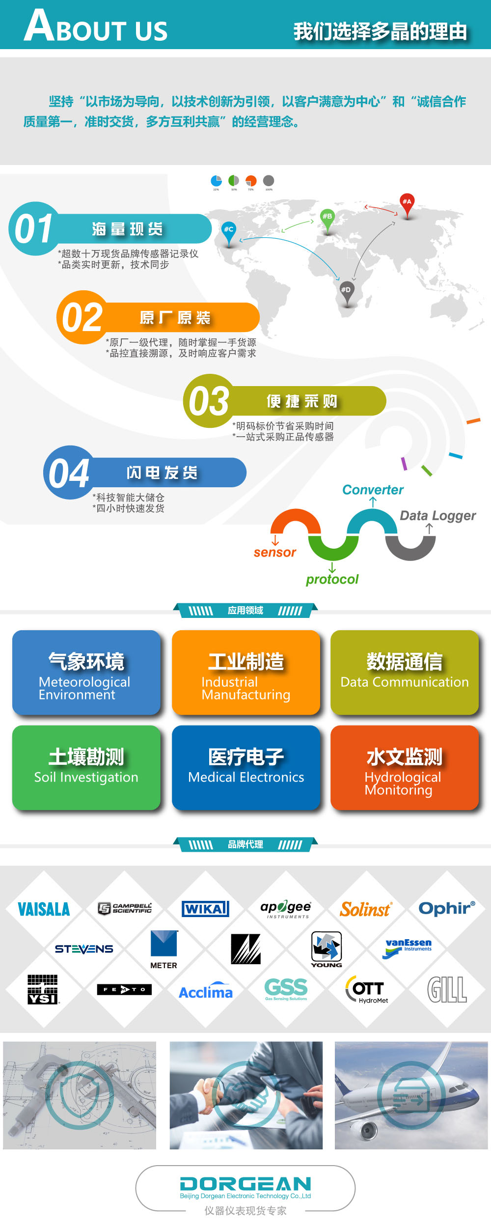 北京多晶電子科技有限公司(Beijing Dorgean Electronic Technology Co., LTD)是一家從事電子與光學儀器儀表先進服務的授權代理和經銷公司,可在氣象、水文、環境監測、空氣質量分析、土壤檢測等領域對您的設施和過程進行測試、測量、分析和控制。我們與Meter、Temtop、Acclima、Hash(HACH)、RM.YOUNG、Met One、Apogee、TSI、YSI、Femto、Hukseflux、Delta-T、GILL、Alphasense、Geonor、Ophir、Solinst等全球知名廠商建立了第三方技術推廣服務授權。我們及時準確地掌握行業信息,在廠家的大力支持下已經成功地為數千家機構和企業提供了各種產品、咨詢、解決方案和服務。