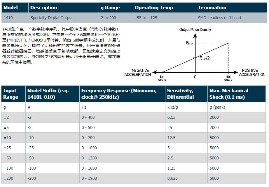 1410型產生一個數字脈沖序列,其中脈沖密度(每秒的脈沖數)與所施加的加速度成比例。它需要一個+ 5V單電源和一個100kHz至1MHz的TTL / CMOS電平時鐘。輸出與時鐘頻率成比例,并且與電源電壓無關。提供了兩種形式的數字信號,用于直接與微處理器或計數器接口。敏感軸垂直于包裝底部,正加速度定義為推動包裝底部的力。外部數字線路驅動器可用于驅動長電纜,或在嘈雜的環境中使用。
