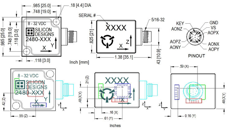 對于所有型號:在沒有特別指定的情況下,默認的供電電壓(Vs)為+8至+32伏直流電,測試條件下的溫度(TC)設定為25攝氏度,并且處于差分模式。加速度測量范圍(量程)為±g,對應的輸出電壓范圍是8000毫伏。