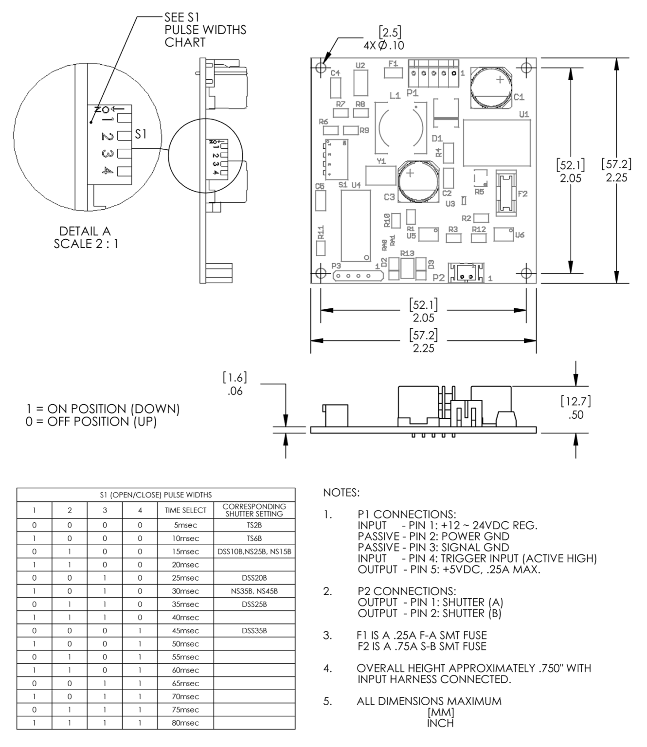 安裝需要連接到用戶提供的電源和輸入和輸出線束連接器,并使用板載 4 位鋼琴開關(guān)選擇打開和關(guān)閉脈沖持續(xù)時(shí)間。TTL 脈沖持續(xù)時(shí)間決定快門的曝光時(shí)間。