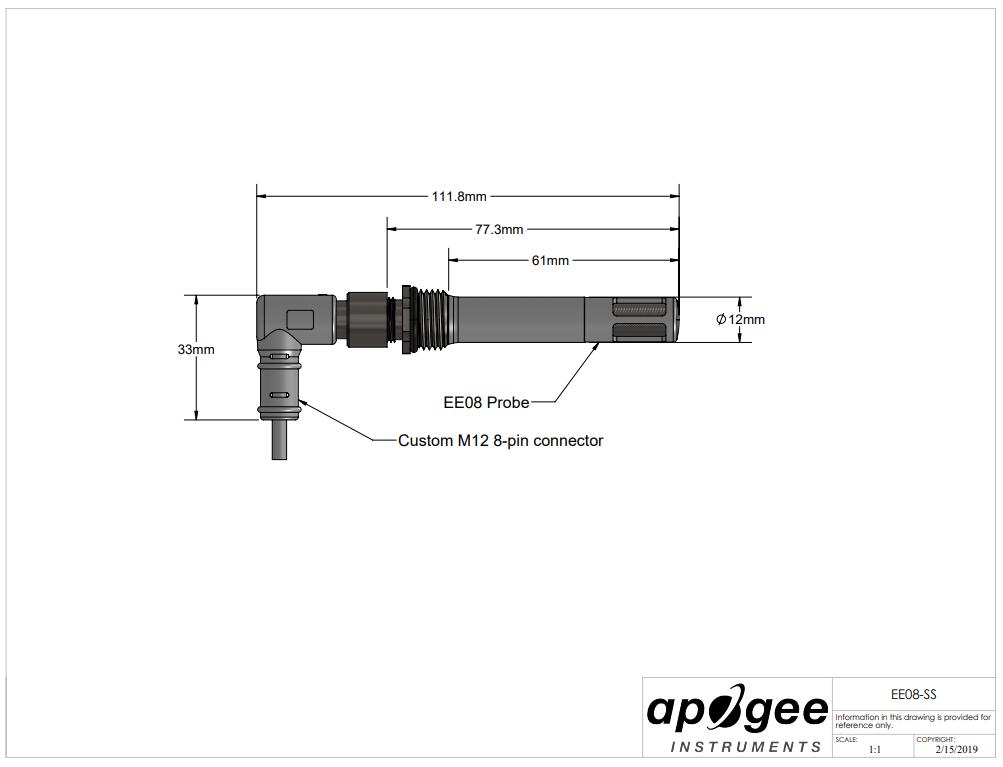 Apogee EE08 是奧地利制造商 E + E Elektronik 生產(chǎn)的 EE08 探頭的定制版本。經(jīng)過(guò)多年的評(píng)估,EE08-SS 已成為我們?cè)诰?、穩(wěn)定性和耐用性方面優(yōu)于更昂貴探頭的不二傳感器。Apogee EE08-SS 具有改進(jìn)的直角、IP67 等級(jí)、不銹鋼 M12 連接器;熱反射白色電纜;和更耐用的金屬網(wǎng)格灰塵過(guò)濾器。Apogee 添加的這些功能僅略微增加了 E + E 基本型號(hào)的價(jià)格,但大大提高了性能并減少了探頭的維護(hù),尤其是在與 Apogee TS-100等風(fēng)扇吸氣式輻射屏蔽一起使用時(shí) 。