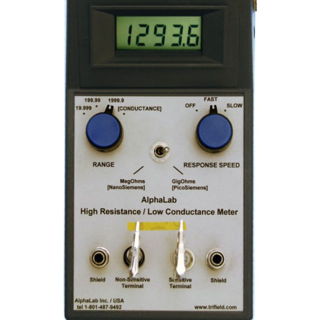 要進行電阻測量,請將 RANGE 切換到1999.9,并將切換開關切換到 GigOhms。如果幾秒鐘后,顯示器上下波動明顯,切換響應速度為慢。如果顯示器在最左邊顯示一個“1”,這意味著電阻大于1999.9千兆歐姆。(在這種情況下,只有電導將給出一個讀數,將在后面描述)。但是,如果顯示器讀取一個數字(1999.9千兆歐姆或更少) ,這是正確的電阻。如果數字很小(或者為零) ,你可以把 RANGE 旋鈕從1999.9調到199.99或者19.999; 如果顯示的數字仍然很小,把切換開關從 GigOhms 調到 MegOhms,然后再次查看1999.9,199.99,19.999的范圍,直到你看到一個足夠大的數字,可以按照你需要的分辨率讀取。如果您走得太遠,一個“1”將出現在顯示器的左側,沒有其他數字將顯示,直到您切換范圍回來。