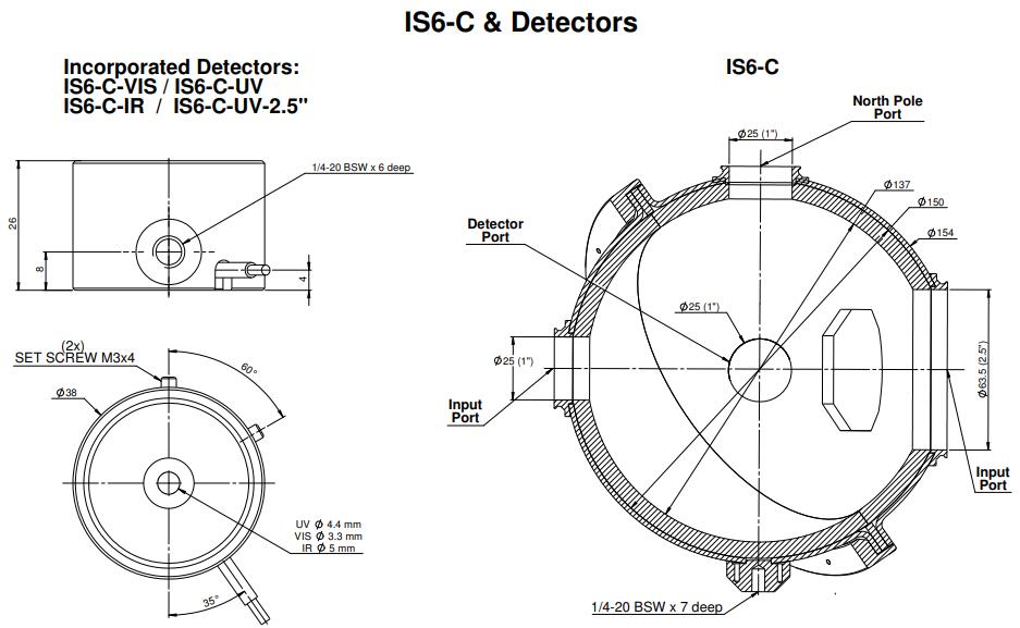 IS6-C-UV-2.5" 是一個 6” 積分球(內部 5.3”),帶有一個硅檢測器,用于大準直 (C) 光束。IS6-C-UV-2.5" 帶有一個 UV 檢測器,是在 200 至 1100nm 范圍內校準,可測量高達 2W 的功率。