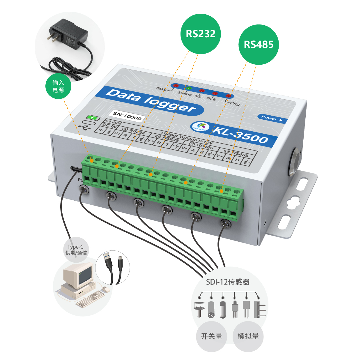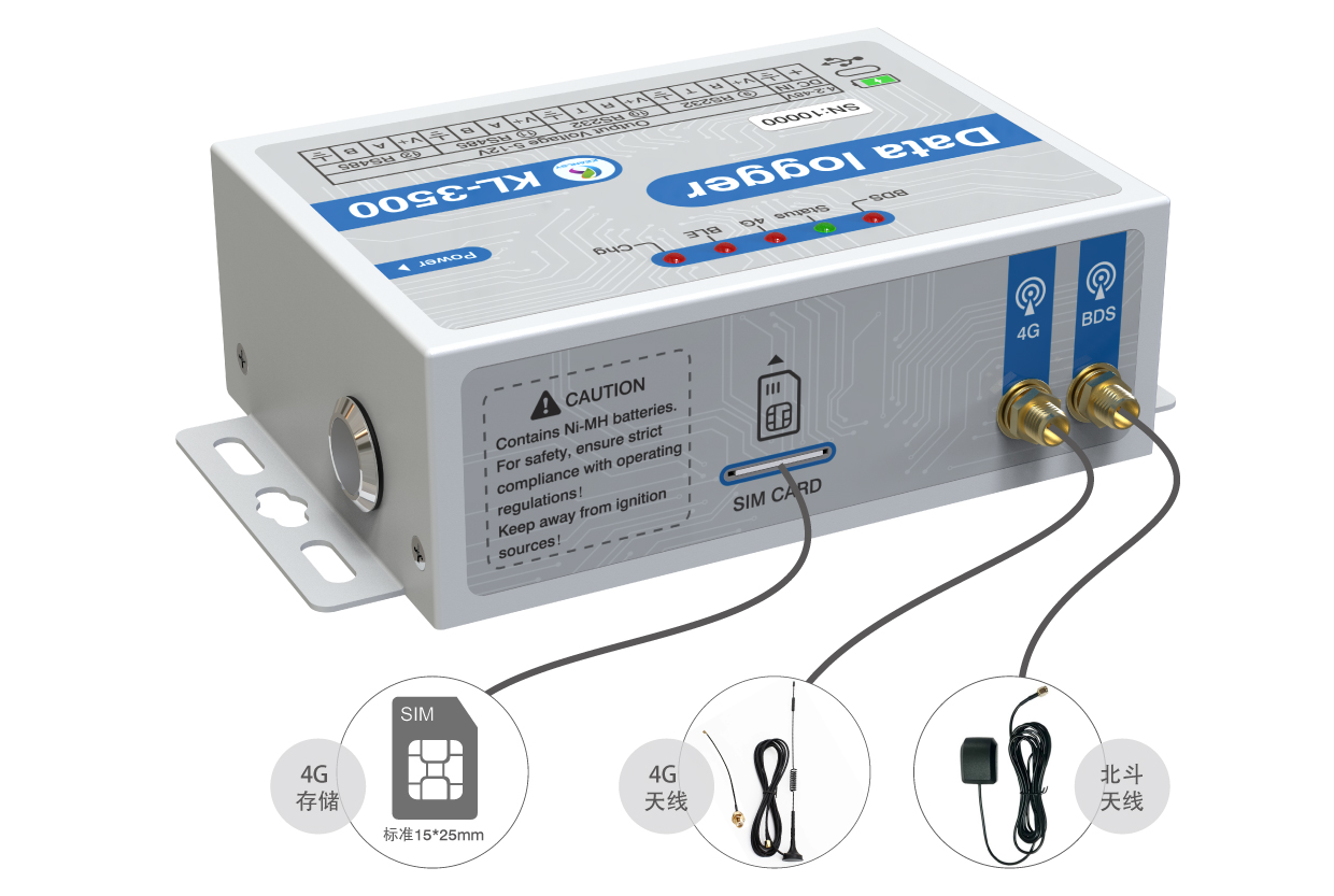 KL-3500專門用于SDI協議和DDI模式,RS485和RS232以及模擬量和脈沖量的傳感器。數據記錄儀有12個插接口(6個傳感器接口,2個帶供電的485,2個帶供電的232,1個大氣壓溫度接口,一個北斗數據口)具體參考軟件界面里的接口說明,一個2P的3.81端子供電口,1個TYPE-C接口(可供電和通信)1個電源按鈕,5個狀態指示燈(LED1為北斗狀態指示燈,LED3為運行狀態指示燈,LED2為4G狀態指示燈,LED4為藍牙狀態指示燈,LED5為充電狀態指示燈),2個天線接口(4G通信天線,北斗天線),上部是電池倉可使用6節鎳氫電池或堿性電池。