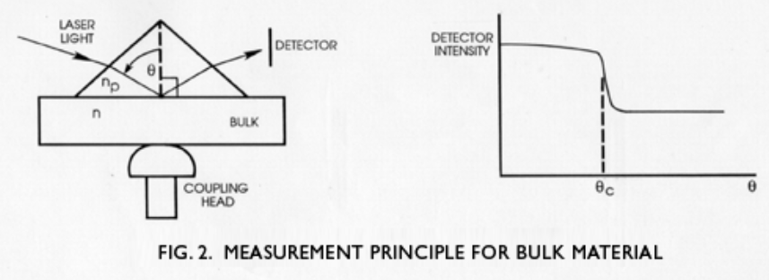 當用作折光儀測量塊狀材料的折射率時(上圖 2),樣品也被夾在棱鏡上,并通過測量樣品/棱鏡界面的臨界角 θc 來確定折射率。厚度超過 10-15 微米的薄膜通常顯示出明顯的臨界拐點角,可以作為散裝材料進行測量。柔性材料易于測量,并且有一個電解池可用于液體測量。與大多數單波長(通常為 589 nm)的傳統折光儀不同,2010/M 可配備多達五個激光器,從而可以在較寬的波長范圍內輕松測量色散。