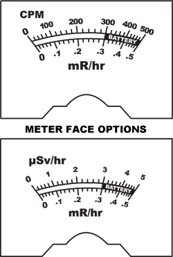 模擬儀表在高達 100 倍最大讀數的字段中保持滿量程。CPM 和 mR/小時規模。可選 SI 刻度計