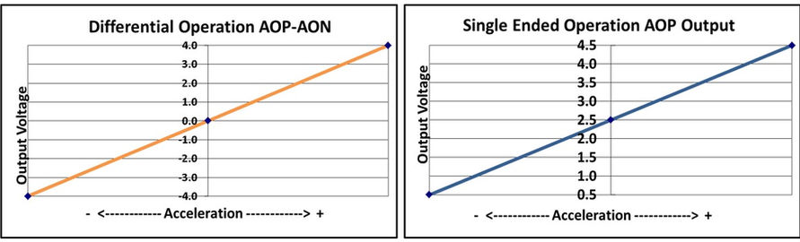 These Accelerometers produce differential analog output voltage pairs (AON & AOP) which vary with acceleration. The signal outputs are fully differential about a common mode voltage of approximately 2.5 volts. At zero acceleration, the output differential voltage is nominally 0 volts DC; at ±full scale acceleration, the output is ±4 volts DC, respectively, as shown in the figure (below). The output scale factor is independent from the supply voltage of +5 volts.