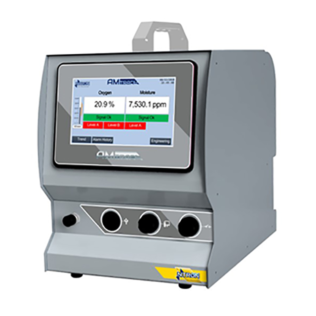 The AM Trace has a fast response time from 20.9% to low PPM Oxygen. AM Trace also incorporates a moisture sensor which allows measurement of moisture in the range of -60°C to +60°C. With touchscreen technology and front facing inputs / outputs this analyzer can be integrated into any system with ease.