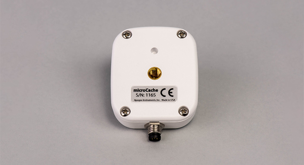 The new Apogee microCache (μCache) is a ruggedized, battery-powered, Bluetooth® Low Energy, single-sensor datalogging device that can be used with Apogee's SQ-110 Original Quantum, SQ-500 Full-spectrum Quantum, SQ-620 Extended Range PFD sensor, SQ-640 Quantum Light Pollution sensor, SP-700 Albedometer, S2-141 PAR-FAR sensor, S2-131 Red - Far-red sensor, SP-110 Silicon-cell Pyranometer, SP-510-SS and SP-610-SS Thermopile Pyranometers, SU-200 UV-A sensor, and the SI-100 Series of Infrared Radiometers.