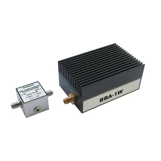 The +20 dB gain version BBA-10 (x10 amplitude amplification) features extremely low noise of only 2.8 dB. The BBA-10-4HP is the high power/high-frequency version with up to 70 mW output power and peak amplitude of max. 2.6 V on 50 Ohm load. This model is indispensable when a high output level and a wider bandwidth are required. The gain expands up to 4 GHz and +13 dB. The high-power BBA-1W model has 1W output power in the range 50 MHz to 1 GHz.