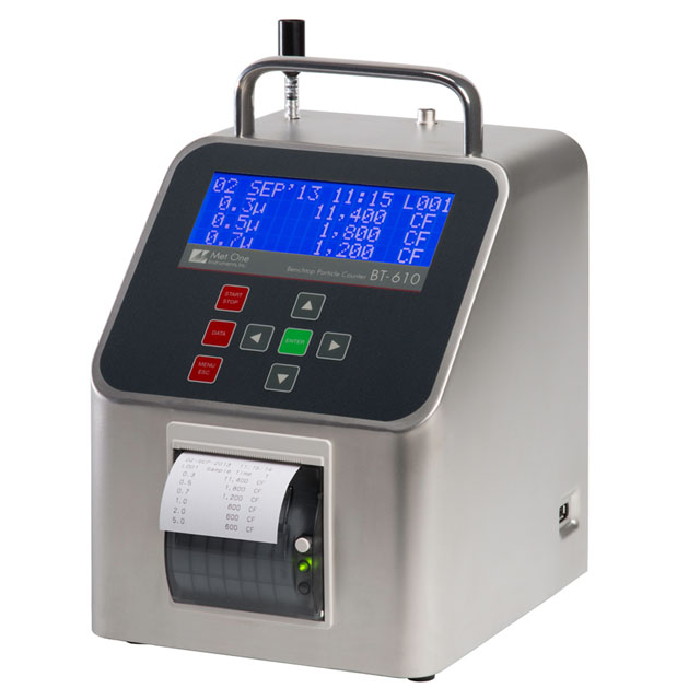 The BT-610 is a compact battery-operated particle counter with six selectable size channels and built-in printer all housed in a portable stainless-steel case. Flow rate is 0.1 cfm (2.83 lpm) and is maintained with volumetric flow control for improved accuracy.