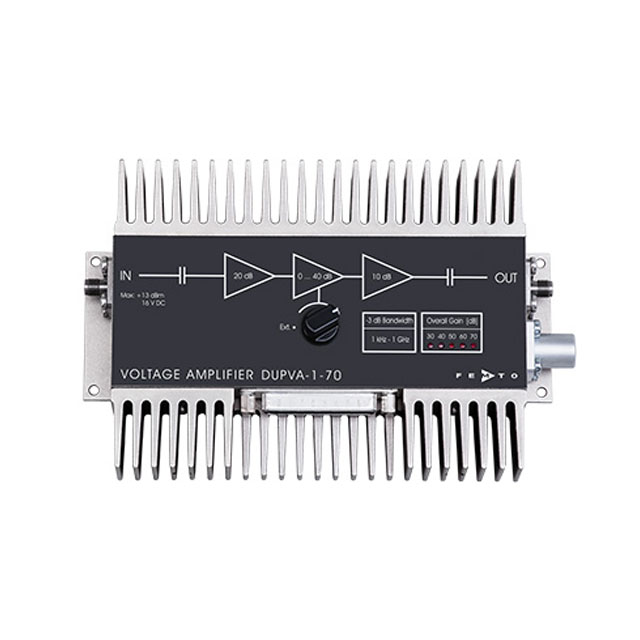 The ultra-wideband voltage amplifiers series DUPVA-1 is designed for fast and precision measurements with large dynamic range. Gain can be adjusted by the local gain selector or via an opto-isolated remote control interface. The gain independent frequency response guarantees for precise time resolved measurements at any gain setting. No significant change in rise time will occur when changing the gain setting which is essential for reliable time-resolved measurements. Additionally, the frequency response is optimized for being very flat over the full frequency range. No gain peaking or significant distortion will occur in pulse and transient measurements.