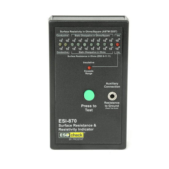 The ESI-870 Resistance/Resistivity Indicator is an LED indicating, wide range resistance measurement instrument with broad application flexibility.It measures surface resistance in accordance with ANSI/ESD STM11.11, surface resistivity in accordance with ASTM D-257, resistance to ground and resistance point to point.
