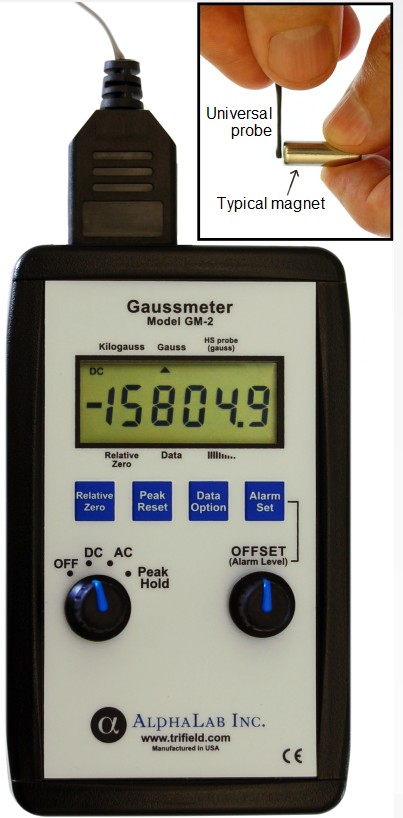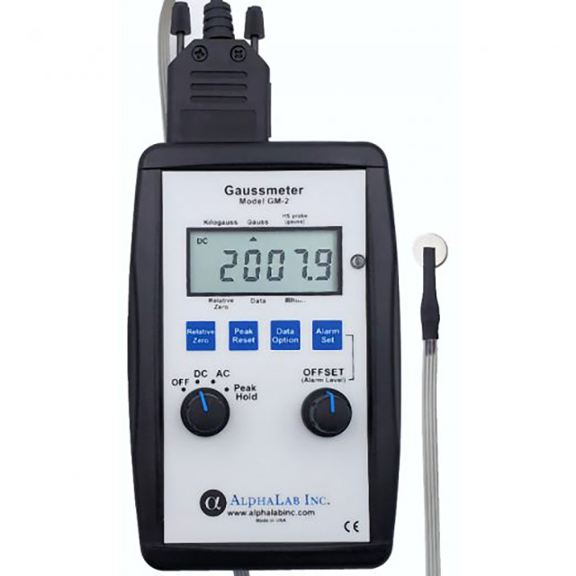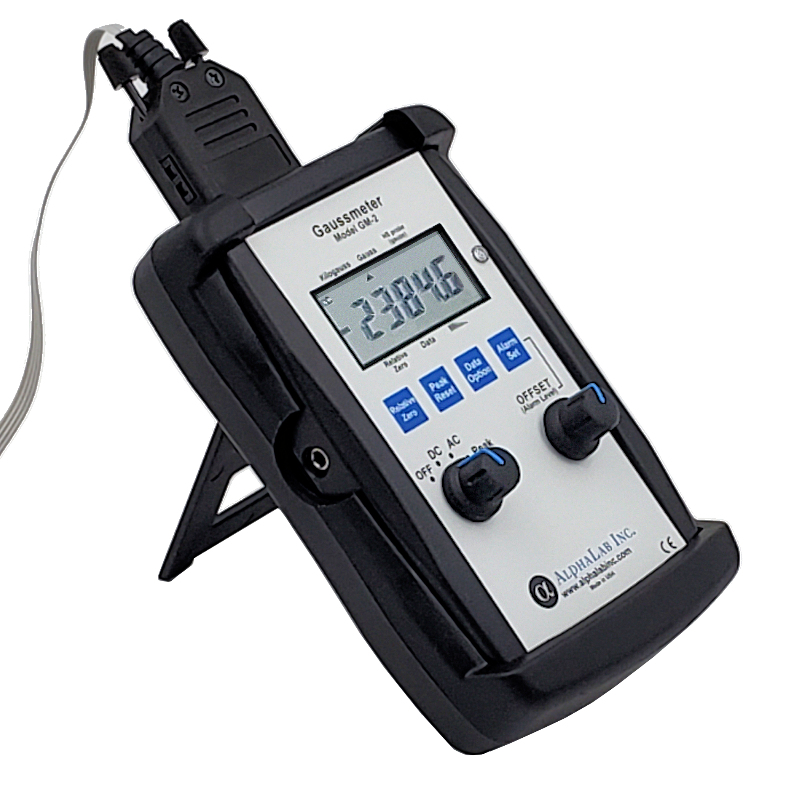 Model GM2 is designed to measure strong and moderate magnetic fields, such as from magnets and solenoids. It is fast and intuitive to use, with an extremely high dynamic range, measuring from 0.0 to 19,999.9 gauss in 0.1 gauss steps. Above 20000 gauss the range automatically changes, reading 20.000 to 29.999 kilogauss (20000 to 29999 gauss) in 1 gauss steps. Therefore a change as small as 0.1 gauss could be measured, for example, in a 14,000 gauss field (typical of the strongest possible field from a permanent magnet). With an optional high-stability probe, it has 0.01 gauss resolution. (High-stability probe range is +/- 799.99 gauss). The GM2 also measures AC field up to 10,000 gauss. A fast peak hold function (2 millisecond window) captures and displays any transients, whether positive or negative. In addition, either of two fast (2 millisecond) alarm functions can be selected when required. The alarm can sound either when the field exceeds a value that you set, or if the field is ever between two values you set.