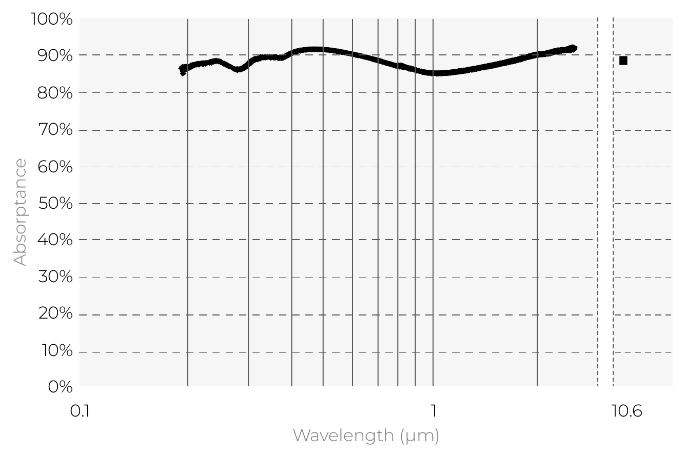Our HE absorber offers a spectral response that is both broadband and spectrally flat, making this detector a solution that can cover several high-power laser measurement needs. Our proprietary manufacturing method also gives this absorber good damage thresholds, for both average power density and energy density.