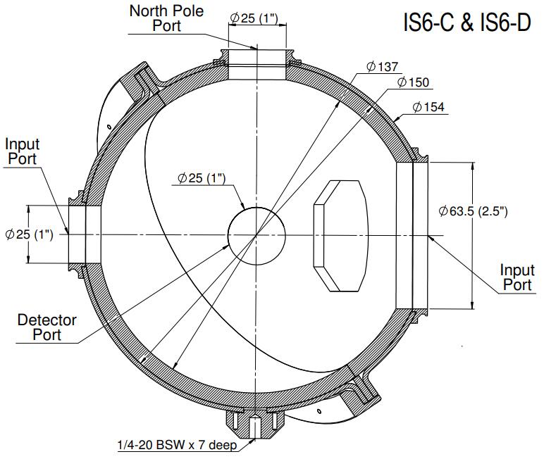 The IS6-C is a 6” integrating sphere (5.3” inside) for use with collimated (C) beams. It has no detectors, where the detection configuration for the IS6-C is done by the user. It can also be used as a uniform light source.