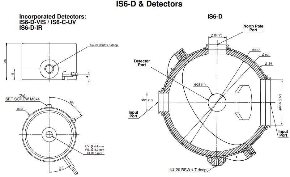 The IS6-D-VIS is a 6” integrating spheres (5.3” inside) with a Silicon detector for use with divergent (D) beams. The IS6-D-VIS comes with a VIS detector, is calibrated from 400 to 1100nm and can measure up to 30W.