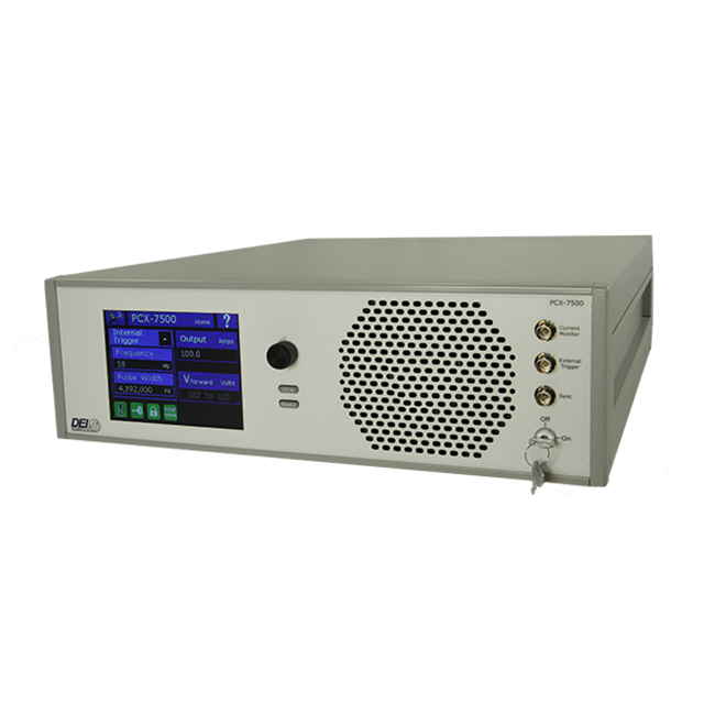 The PCX-7500 is an air-cooled, high power current source designed to drive laser diodes, bars, and arrays. The output current can be set from 10 A to 450 A, compliance voltage is 24 V to 30 V. The pulse width is adjustable between 4 μs to 5,000 μs, with a frequency of 8 Hz to 10,000 Hz.