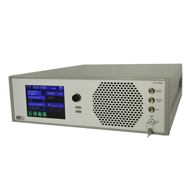 The PCX-7500 is an air-cooled, high power pulsed current source designed to drive laser diodes, bars, and arrays. The output current can be set from 10 A to 450 A, compliance voltage is 62 V to 66 V. The pulse width is adjustable between 4 μs to 5,000 μs, with a frequency of 8 Hz to 10,000 Hz.