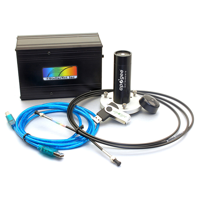 The PS-200 measures a wavelength range of 300 to 850 nm. The spectroradiometer comes in a complete package ready to connect to your computer and begin making measurements. Typical applications include measurement of spectral output (energy flux density, photon flux density, or illuminance) of different radiation sources (often for plant or human lighting), and reflectance and transmittance measurements of natural and synthetic surfaces and materials (often plant leaves and canopies.