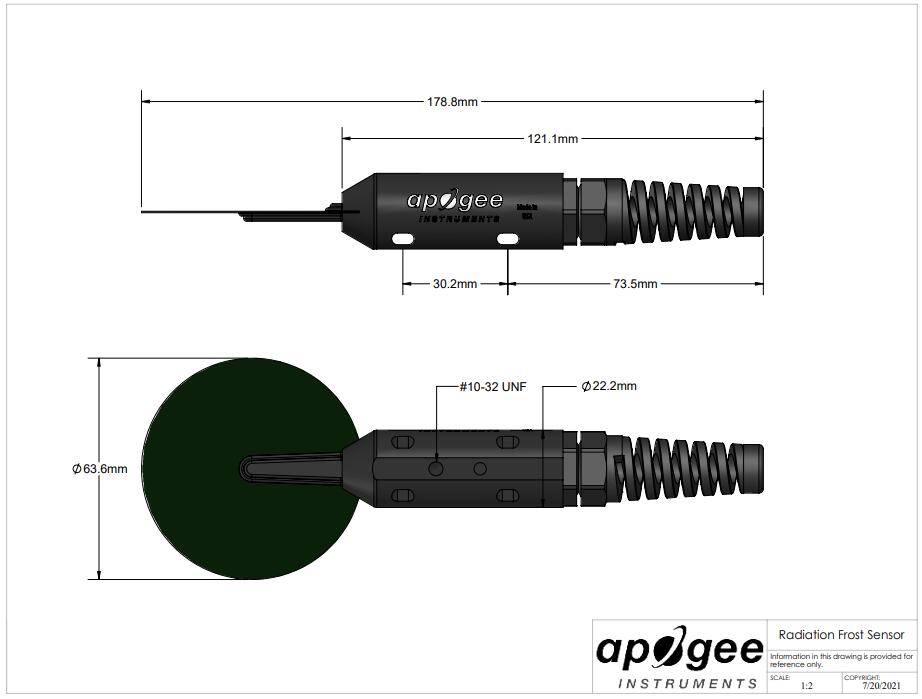 The SF-110-SS has an un-amplified voltage output and high-quality cable terminating in pre-tinned pigtail leads for easy connection to dataloggers and controllers. The detector contains a precision thermistor that mimics a leaf. The SF-110-SS provides close approximations of leaf temperatures and has a temperature measurement range of -50 to 70 ℃. Typical applications include leaf temperature estimates in cropped fields, orchards, and vineyards. Leaf temperatures returned by the detector can then be used to alert growers to the potential of frost damage to crops. Sensor includes IP68 marine-grade stainless-steel cable connector 30 cm from head to simplify sensor removal and replacement for maintenance and recalibration. While most users choose to mount the SF-110-SS to a branch or stick using zip ties, the AM-260 mounting fixture can be used as a more permanent mounting option.