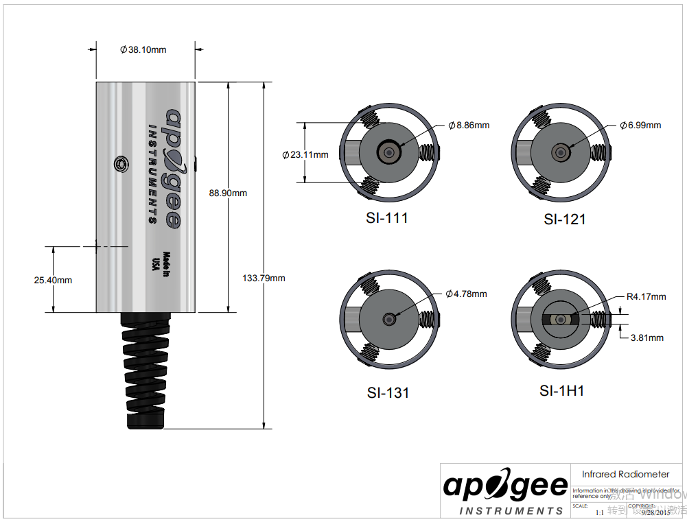 The SI-121 is an unamplified analog sensor with a voltage output and high-quality cable terminating in pre-tinned pigtail leads for easy connection to dataloggers and controllers. The sensor has a 18° half-angle field of view and a response time of 0.6 seconds. Typical applications include plant canopy temperature measurement for use in plant water status estimation, road surface temperature measurement of determination of icing conditions, and terrestrial surface (soil, vegetation, water, snow) temperature measurement in energy balance studies. Sensor includes IP68 marine-grade stainless-steel cable connector 30 cm from head to simplify sensor removal and replacement for maintenance and recalibration. The SI-121-SS is designed to be mounted with an Apogee AM-250 commercial-grade mounting bracket.