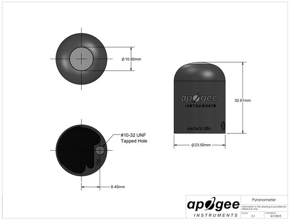 Apogee Instruments SP series pyranometers consist of a cast acrylic diffuser (filter), photodiode, and signal processing circuitry mounted in an anodized aluminum housing, and a cable to connect the sensor to a measurement device. Sensors are potted solid with no internal air space and are designed for continuous total shortwave radiation measurement on a planar surface in outdoor environments. SP series sensors output an analog voltage that is directly proportional to total shortwave radiation from the sun. The voltage signal from the sensor is directly proportional to radiation incident on a planar surface (does not have to be horizontal), where the radiation emanates from all angles of a hemisphere.