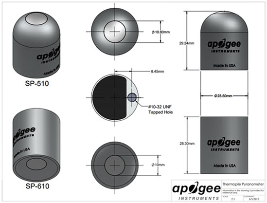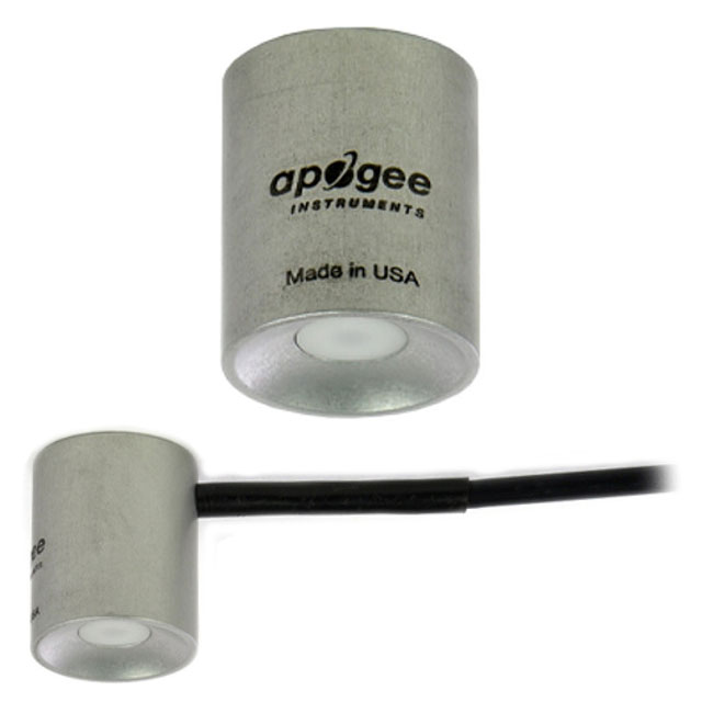 These sensors can also be coupled with our downward facing pyranometer to form an albedometer. For this application, we recommend the Apogee SP-710-SS Albedometer sensor package, which consists of one SP-510-SS upward-facing pyranometer, one SP-610-SS downward-facing pyranometer, an AY-001 differential splitter, and an AW-605-SS 5 meter cable. For mounting to a mast or directly to a solar panel, we recommend using either the AL-130 Albedometer mounting bracket or the AM-500 Net Radiometer mounting bracket paired with an AM-130 mounting fixture with 12" rod.