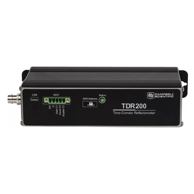 The TDR200 Time-Domain Reflectometer is the core of the Campbell Scientific time-domain reflectometry (TDR) system. TDR systems accurately determine soil volumetric water content, soil bulk electrical conductivity, rock mass deformation, or a user-specific time-domain measurement. One Campbell Scientific data logger can control multiple TDR200 reflectometers.