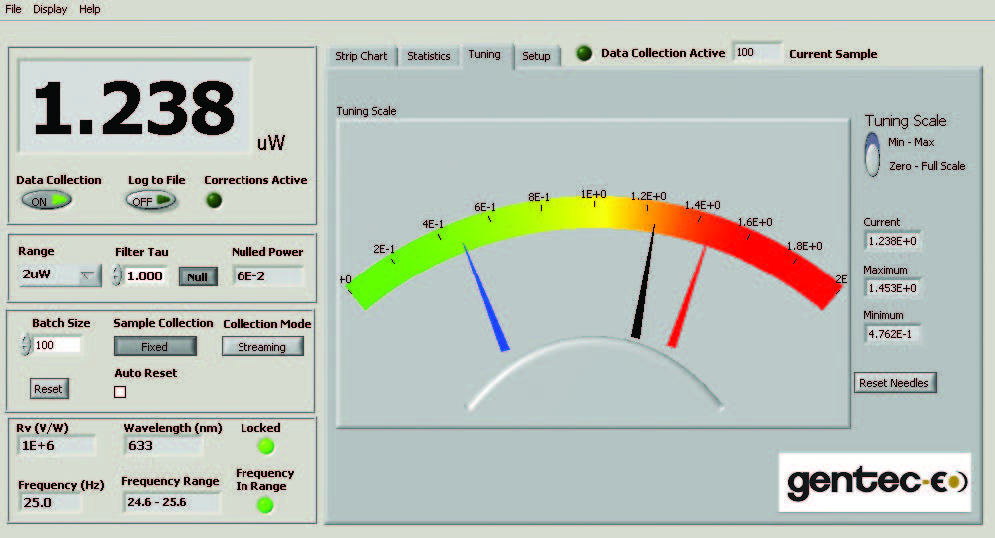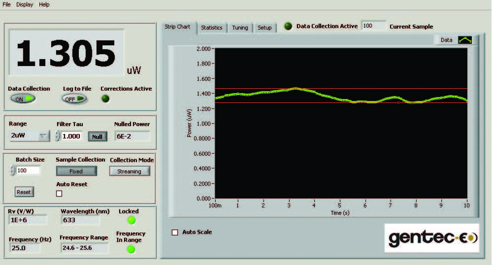 Instrument controls and the radiant power measurement are always visible, making it easy to change the radiometer settings, no matter which display tab is selected. Instrument controls include: range, filter tau, batch size, data collection mode, reset options, and a null button for background cancellation. In addition, there are more set up and operation status indicators including: detector Rv, wavelength, frequency (actual), locked and frequency in range lights. The strip chart displays the radiant power measurement in watts, either continuously or by the batch. Select full scale, auto scale or use our manual scaling option.