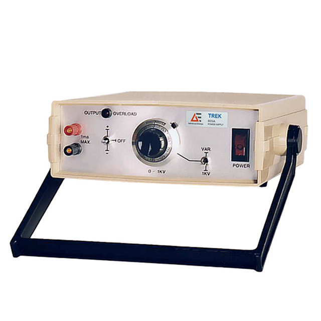 The Trek 605A high voltage reference supply provides precise control of output voltages in the range of 0 to +1 kVDC or 0 to -1 kVDC with an output current range of 0 to ±1 mADC. The instrument offers both fixed and variable operating modes. The Trek 605A is protected against overcurrent conditions that may be generated by output short circuits to ground. In addition, a digital enable feature provides a connection for a remote device to turn on and off the high voltage of the instrument, making it suitable for automated control systems.