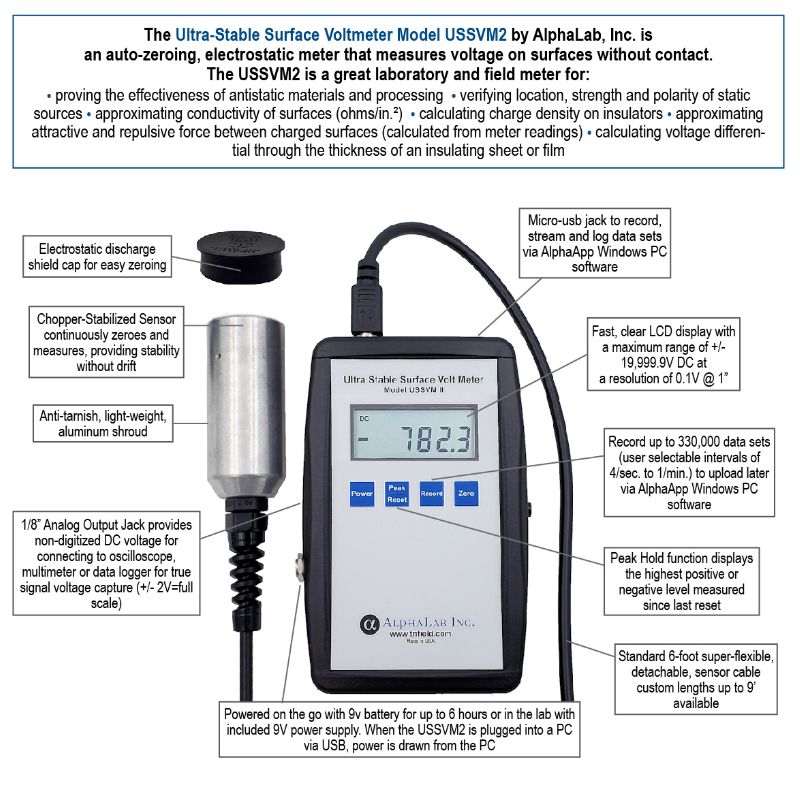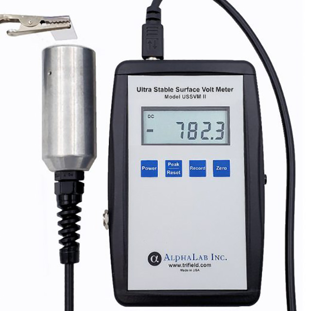 The Ultra Stable Surface Voltmeter Model USSVM2 utilizes a sensor shutter/switcher technology which provides long term stability without drift. This technology also eliminates false or offset readings due to charged air molecules (air ions). The sensor has a 29 inch detachable cable which can be extended up to 9’.