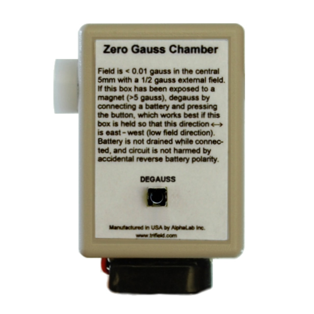 Demagnetizing a zero gauss chamber with an external degausser is difficult, even if a degausser is available. Often an external degausser is not strong enough to erase the magnetism of the inner shield, and using a degausser (which is fairly large) is not convenient. When using the ZGC, a single press of the degauss button brings the internal field to less than 0.01 gauss (in all three axes) within a 5 mm wide x 9.4 mm diameter region in the center of the chamber. While the battery is connected, no power is consumed except when the degauss button is being pressed. Even then, a typical 9 volt battery (included) can power over 10 million degauss cycles. After degaussing, the field is < 0.01 gauss regardless of the orientation of the chamber (within the Earth field). If the long axis of the chamber (left-right direction in photo below) is specifically oriented east-west during the degauss, the internal field will be < 0.002 gauss, although most gaussmeters do not require that degree of precision.