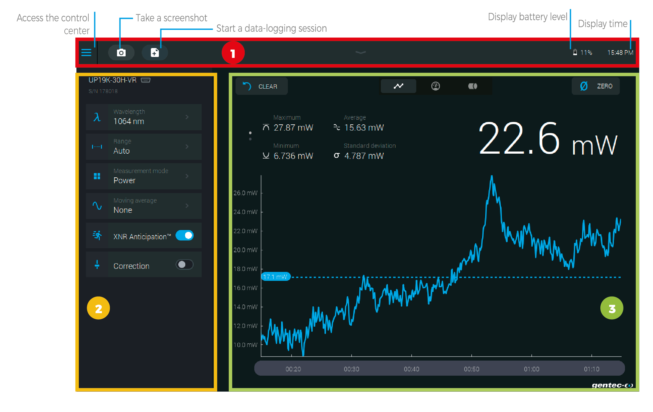 Faster than an analog needle thanks to XNR AnticipationTM! This mode is particularly useful when tuning a laser. The real-time value and statistics are always visible at the top of the screen.